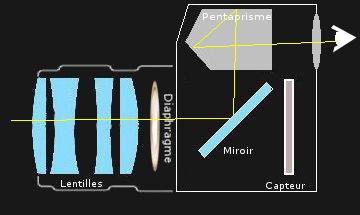 Sur un reflex, le système est plus complexe. C’est d’ailleurs sa spécificité : pouvoir déporter l’image issue de l’objectif vers le viseur optique. Pour cela, les reflex intègrent un miroir basculant situé juste devant le capteur, qui va renvoyer l’image vers un prisme qui alimente ainsi le viseur. Pour prendre la photo, il suffit de relever le miroir, puis d’ouvrir le rideau.